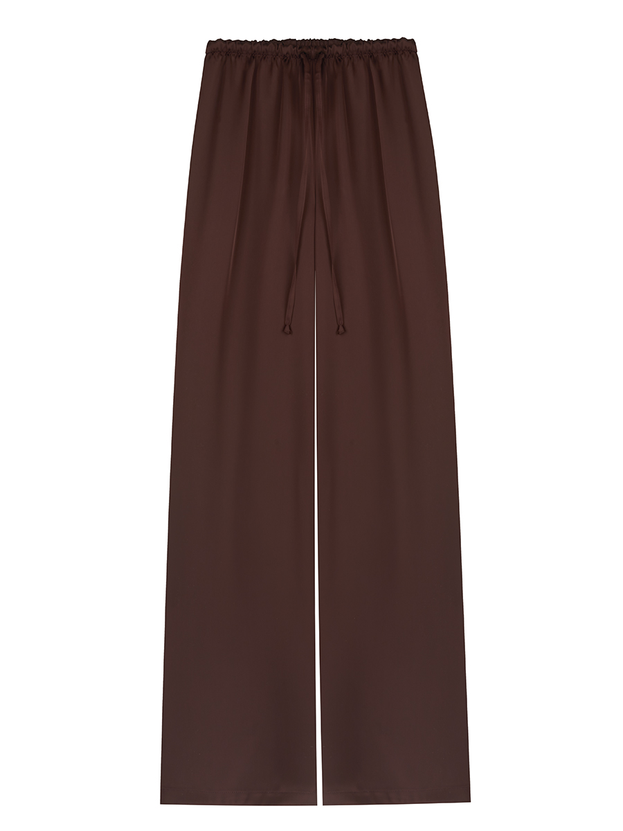 Брюки свободные полной длины на низкой талии, посадка регулируется за счет завязок на поясе.