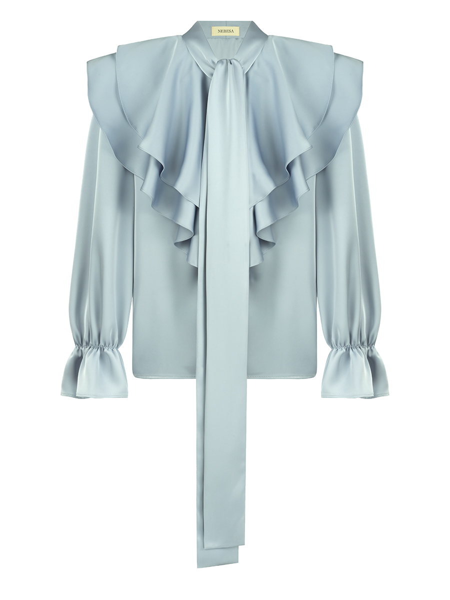 Блузка свободного кроя на пуговицах, из плотной струящейся ткани, впереди волан и завязки, драпирующиеся в бант.