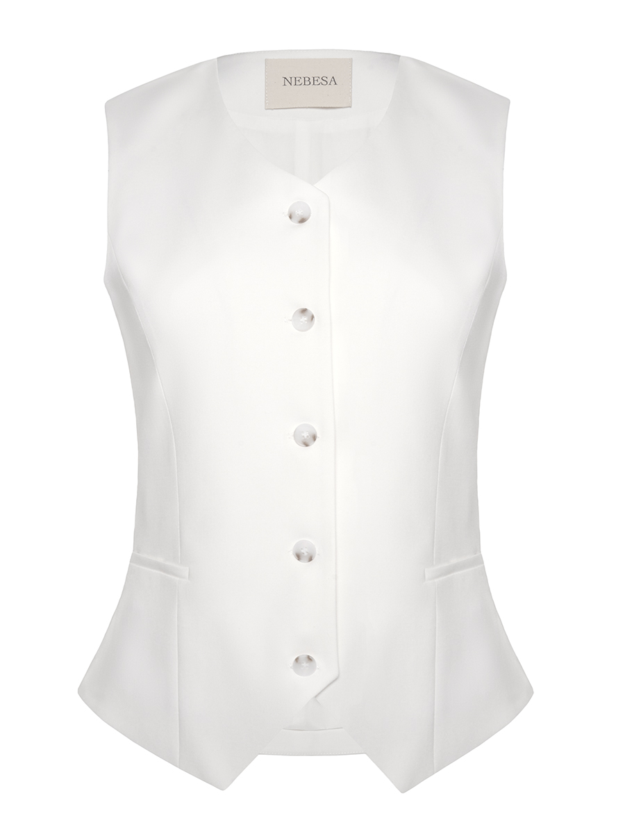 Жилет классический, приталенный силуэт, застегивается на пуговицы, хлястик на спине.