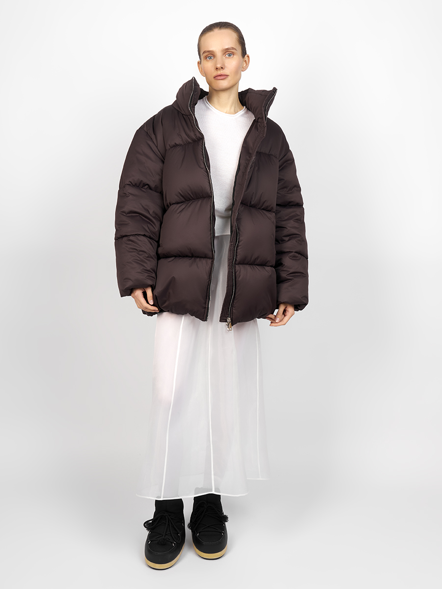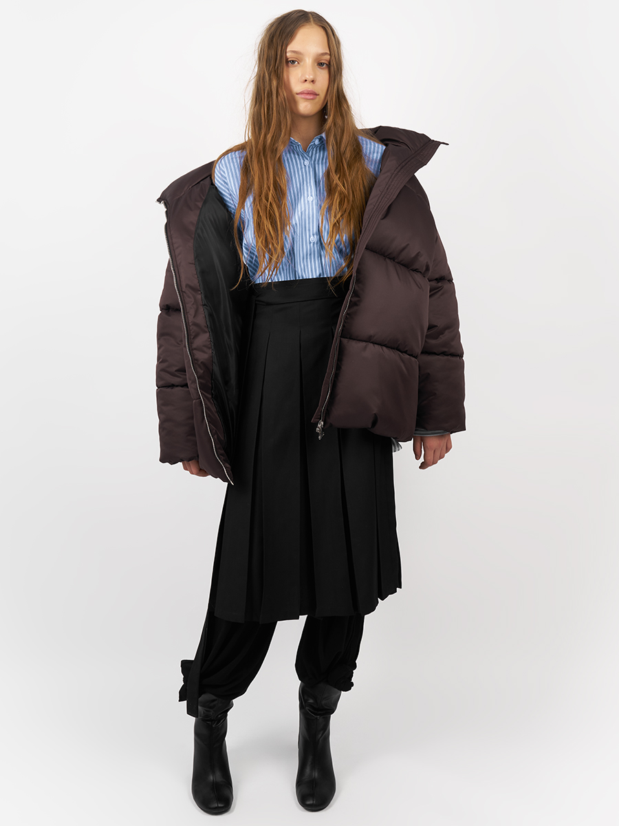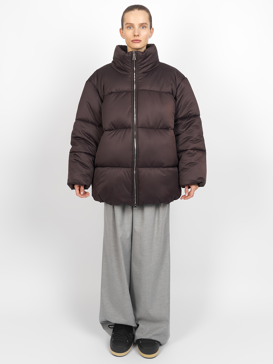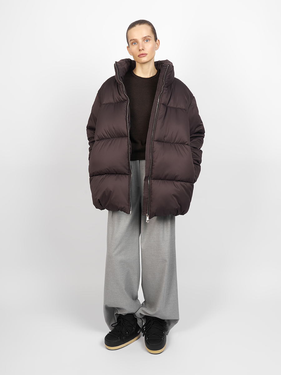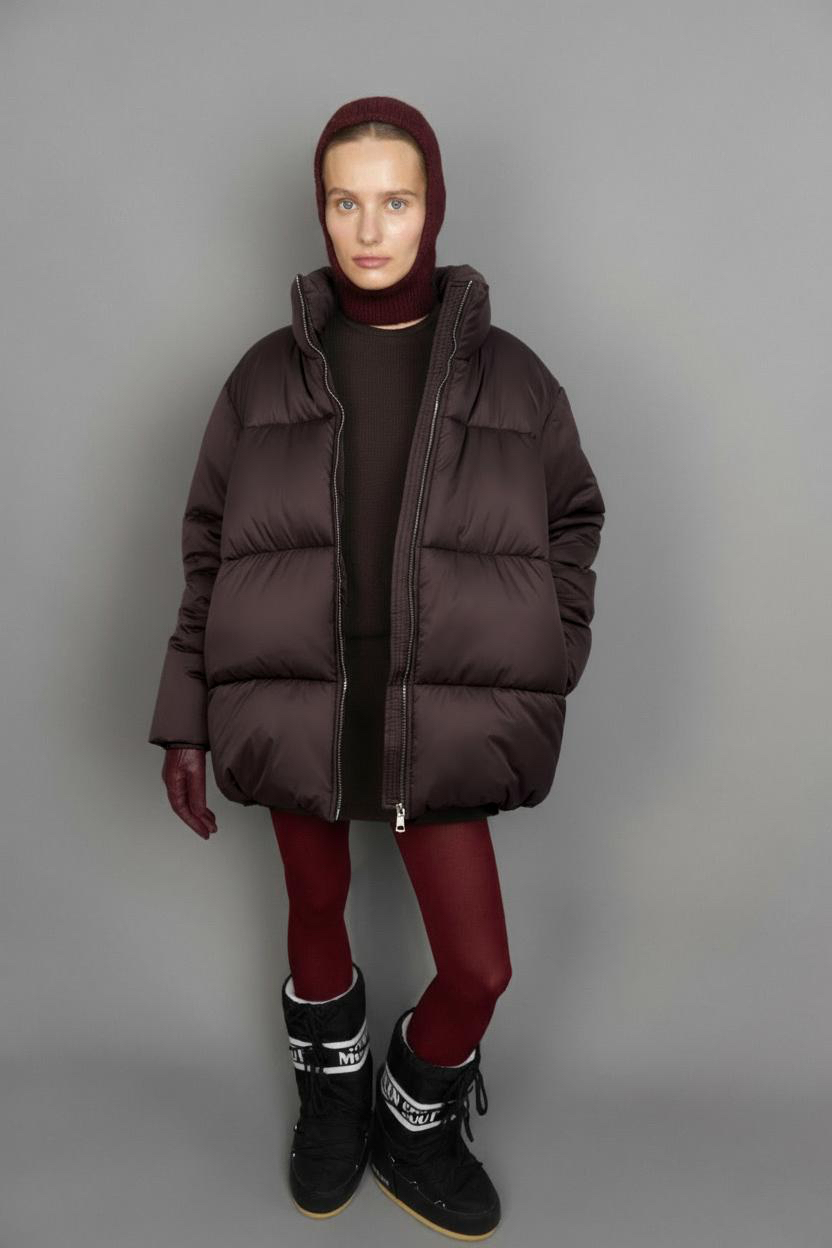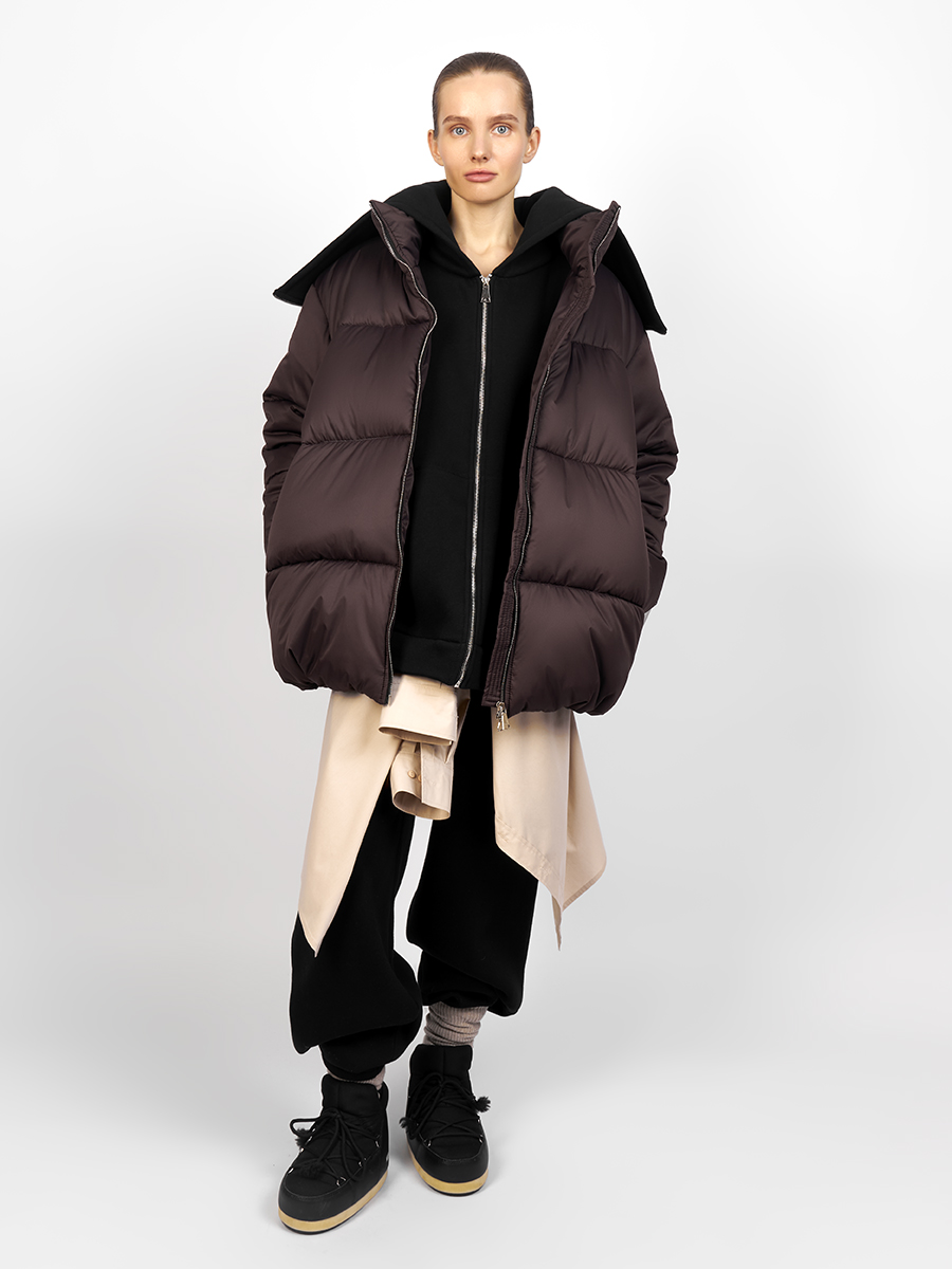 Благодаря свободному крою, пуховик можно сочетать с теплыми свитерами, создавая образы в стиле casual.