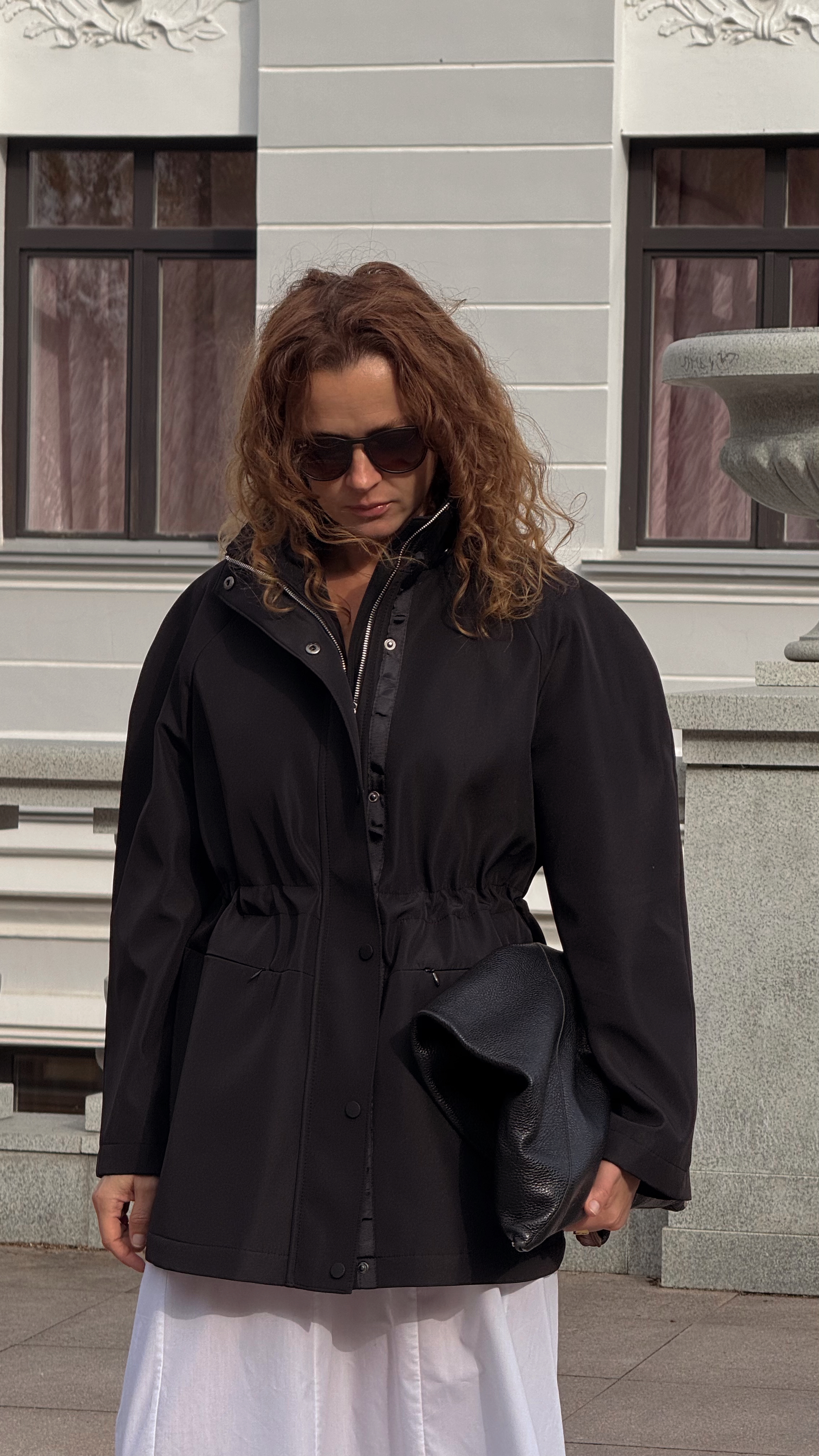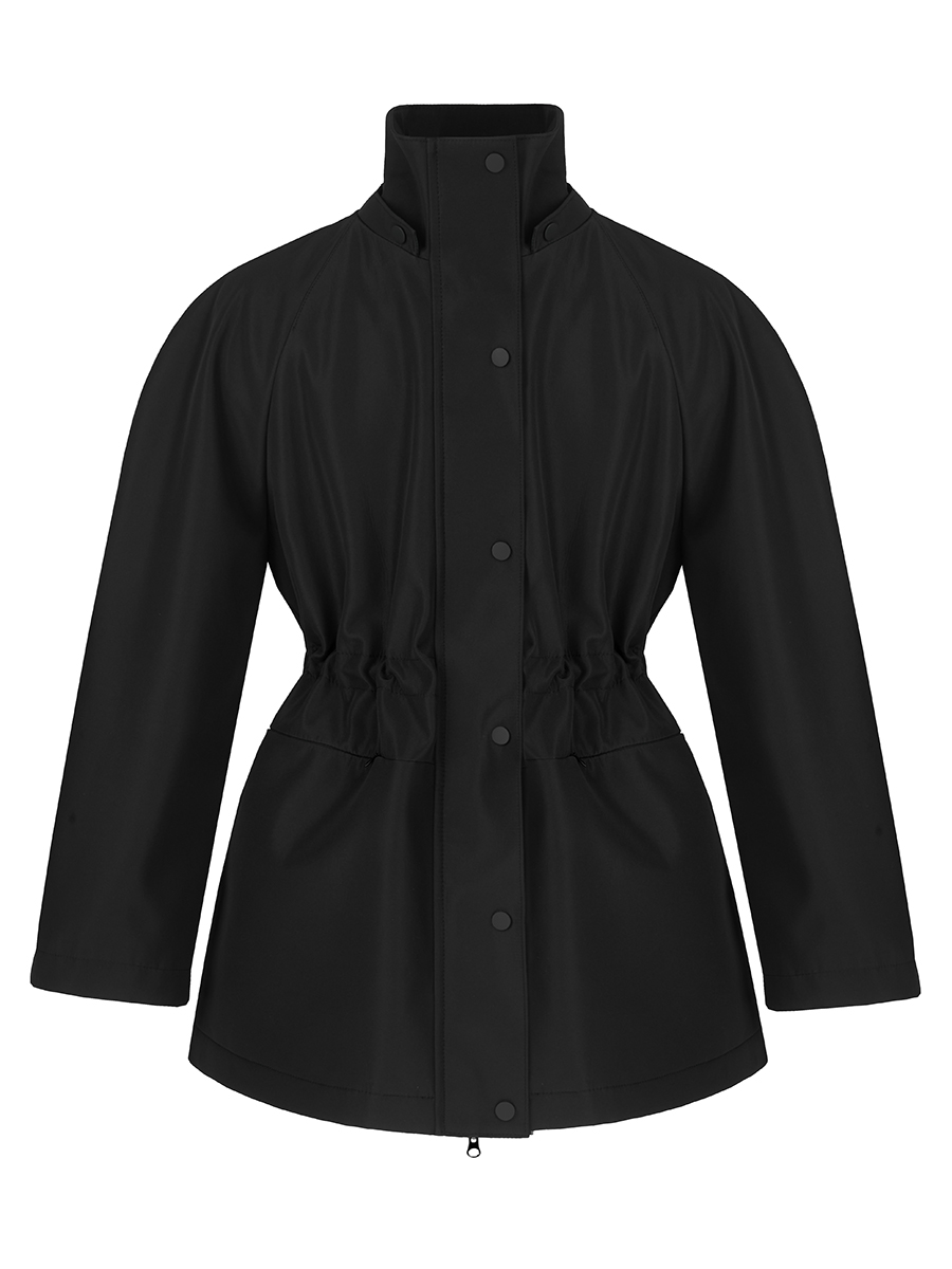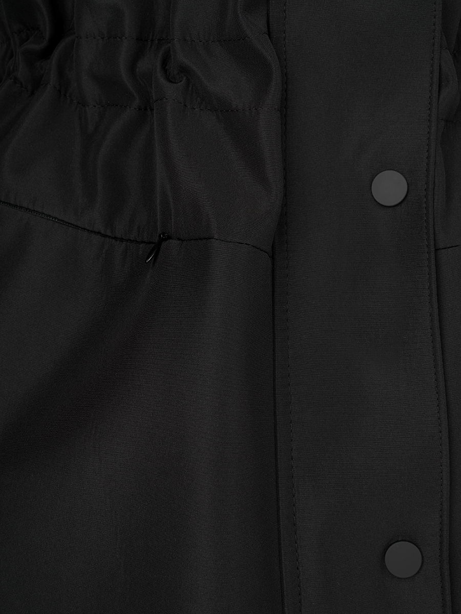 Объемная парка из плотной непромокаемой ткани, впереди карманы на потайной молнии, акцент на талии за счет регулируемой кулисы.
