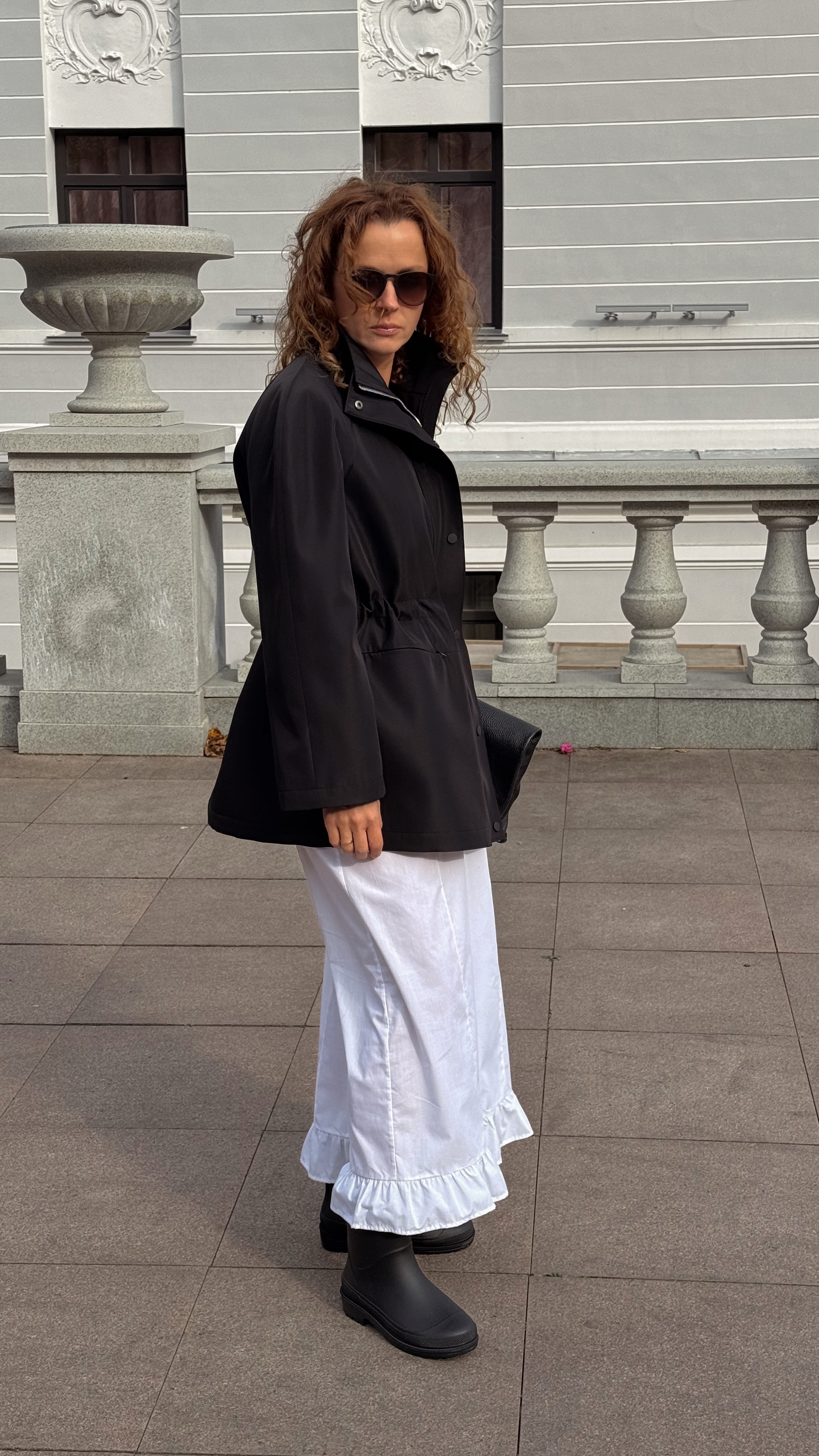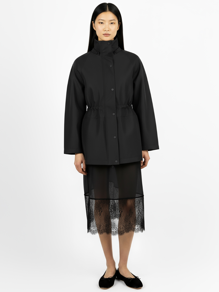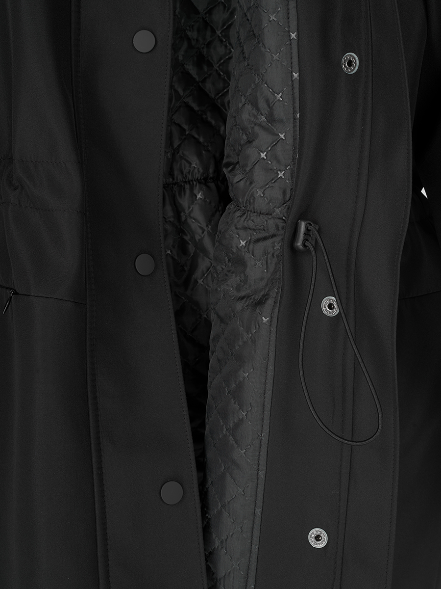 Объемная парка из плотной непромокаемой ткани, впереди карманы на потайной молнии, акцент на талии за счет регулируемой кулисы.