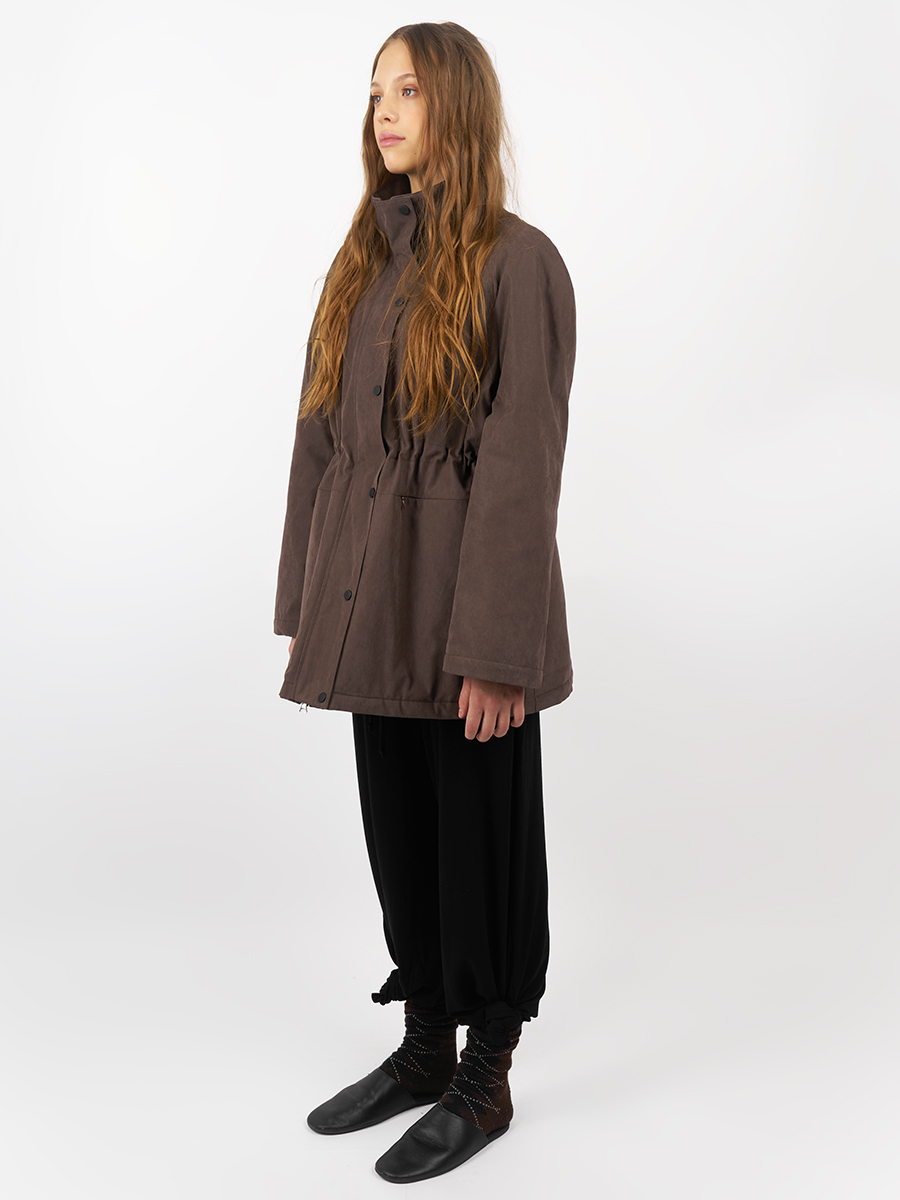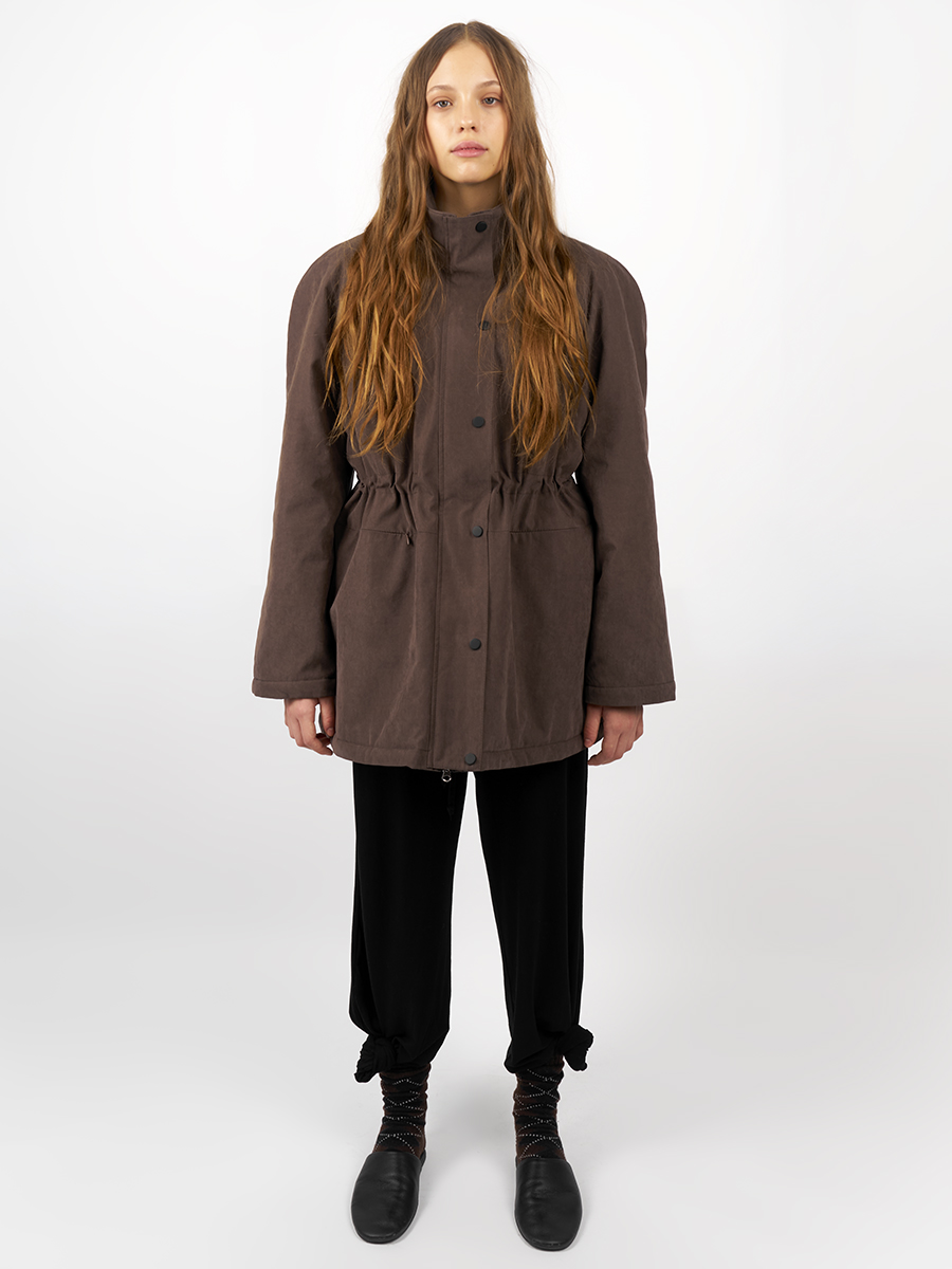 Объемная парка из плотной непромокаемой ткани, впереди карманы на потайной молнии, акцент на талии за счет регулируемой кулисы.