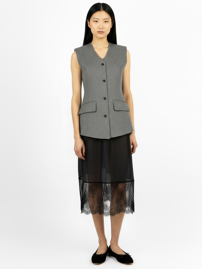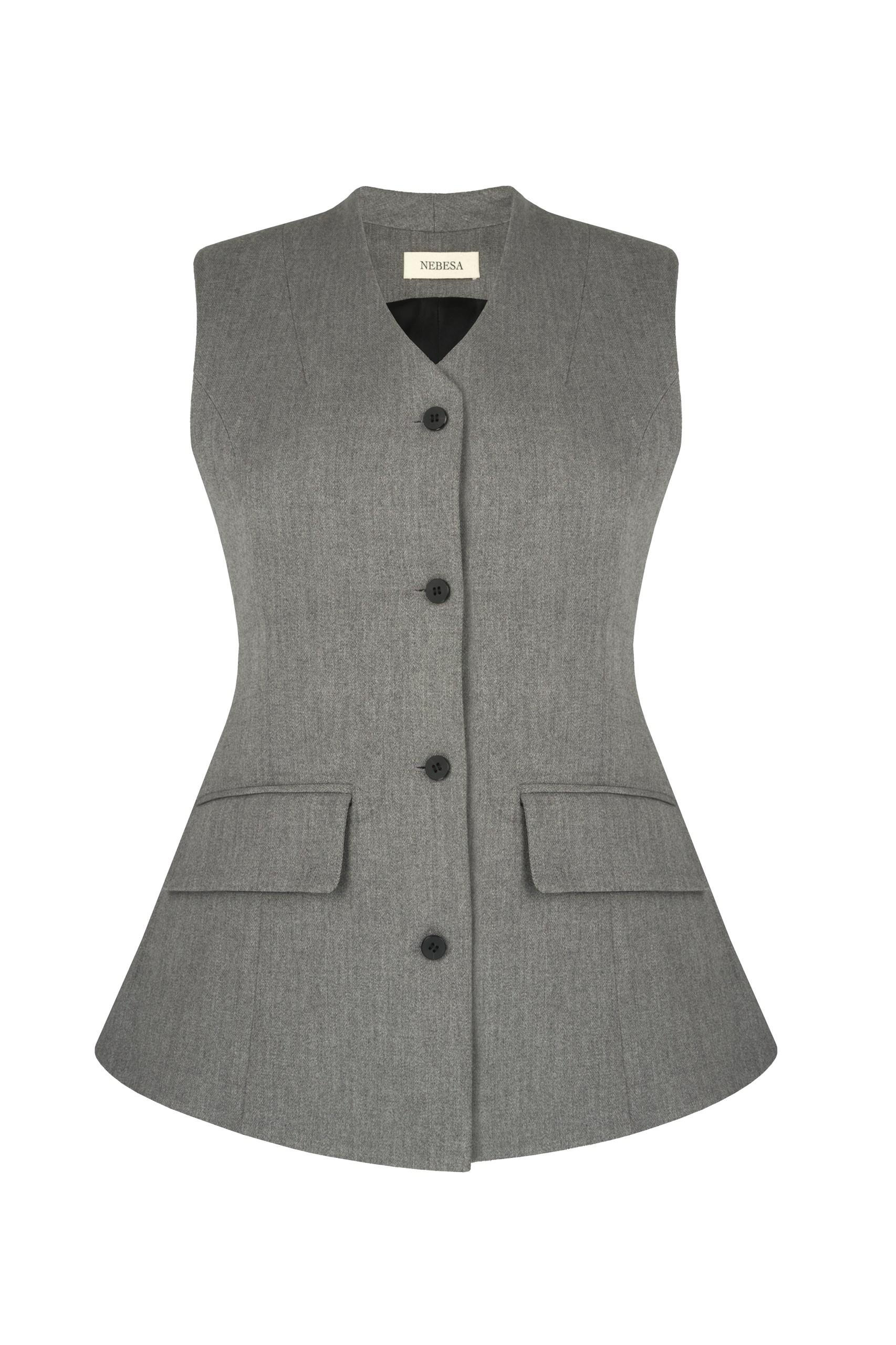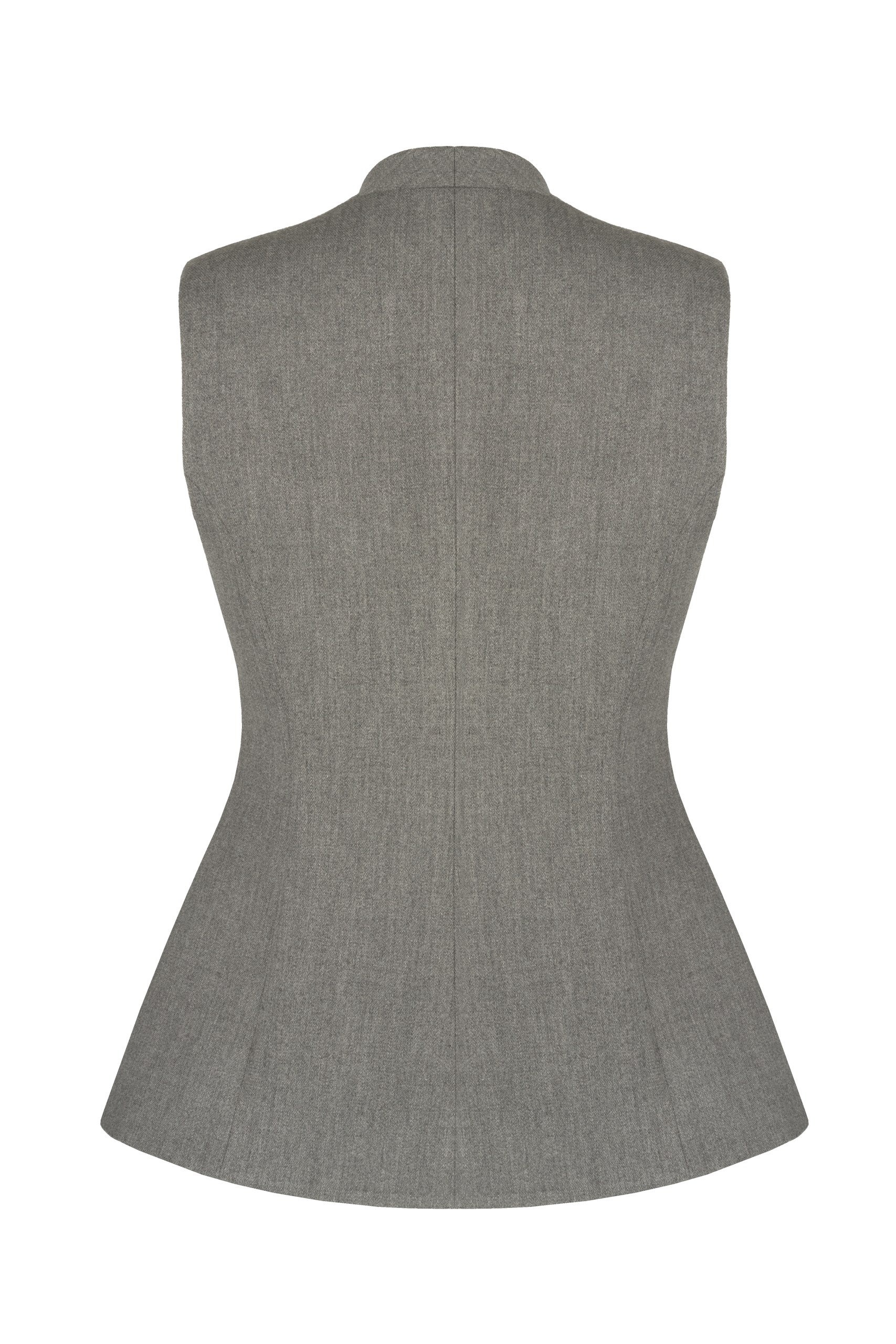 Жилет классический, приталенный силуэт, застегивается на пуговицы, хлястик на спине.