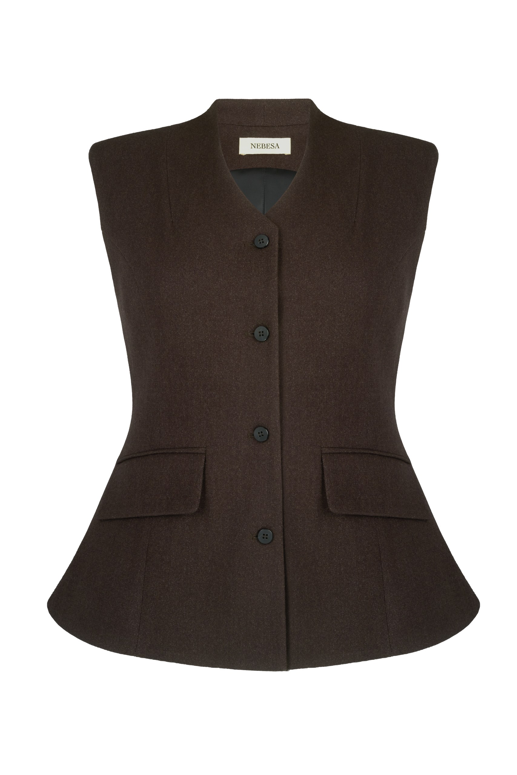 Жилет удлиненный, приталенный, имитация карманов с клапаном, увеличенная линия плеча с подплечником.